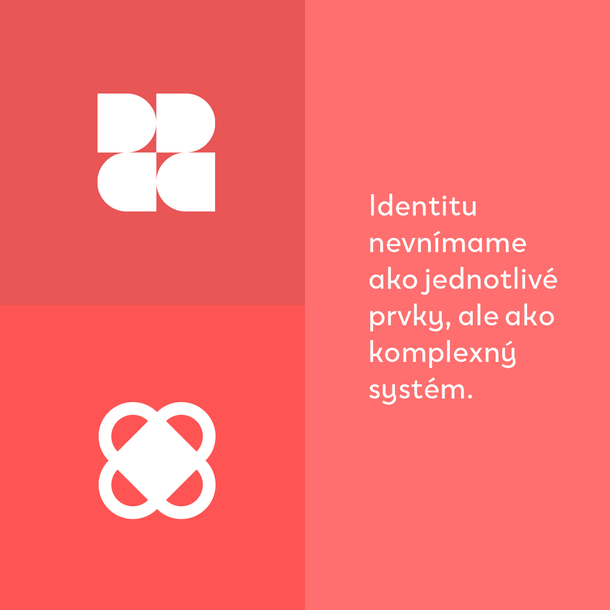 Identitu nevnímame ako jednotlivé prvky, ale ako komplexný systém. Všetky vizuálne komponenty spolupracujú a vytvárajú konzistentný obraz značky naprieč všetkými výstupmi. Dbáme na to, aby bola vizuálna identita funkčná, flexibilná a použiteľná.